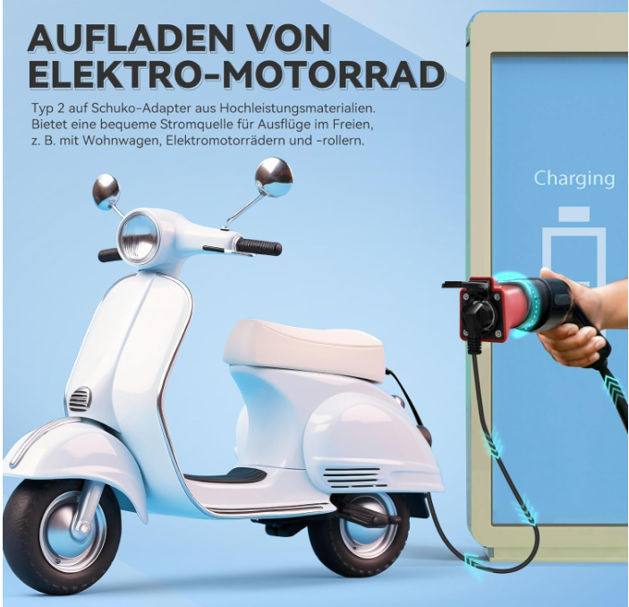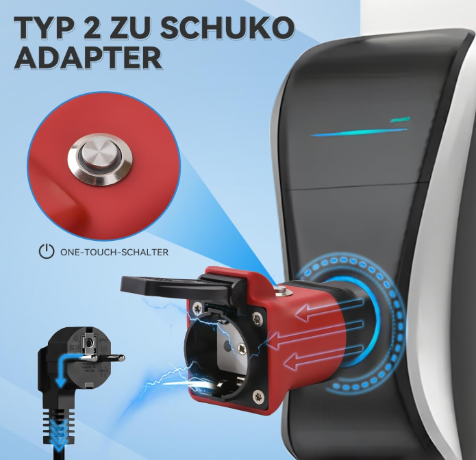 Connectez la Prise Schuko (type F) de votre véhicule à l'adaptateur de charge. Vérifiez que la prise est bien fixée afin d'assurer une connexion de charge stable et sécurisée.
